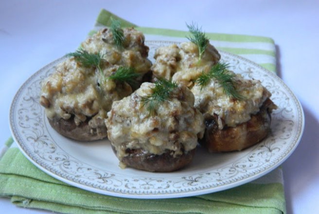 Spalam ciupercile rapid sub jet de apa, le stegem bine, apoi le scoatem piciorusele. Tocam piciorusele marunt. Curatam ceapa si o tocam marunt. O punem la calit in unt, apoi adaugam piciorusele tocate. Lasam amestecul la racit. Creierul il curatam de pielite si il tinem cel putin o ora in apa rece, dupa care il scurgem si il oparim pentru cateva minute in apa cu putina sare. Il scoatem si il tocam marunt, apoi il amestecam cu ceapa si piciorusele ciupercilor calite, sare si piper macinat.Presaram cate putina sare in palariile ciupercilor. Umplem palariile cu amestecul format. Asezam ciupercile intr-o tava si dam tava la cuptorul preincalzit pentru aproximativ 20 de minute. Presaram cascavalul ras deasupra si mai lasam 5 minute sa se rumeneasca. Servim ciupercile calde sau reci.