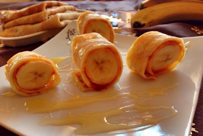 Se unge fiecare clatita cu putina dulceata, se pune cate o banana decojita, se ruleaza cu grija si se lasa deoparte.