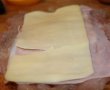 Pe fiecare felie aranjam cate 2 felii subtiri de cascaval , apoi cate o felie de sunca si mai punem iar cate o felie-doua de cascaval. Rulam cu mare grija si inchidem rulada cu ajutorul scobitorilor.