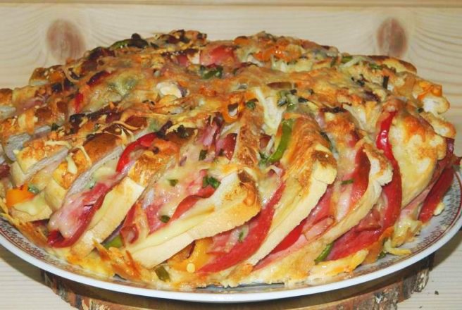Toate ingredientele trebuie sa fie feliate si cascavalul (250g) ras. Se pune intre feliile de paine cate o felie de cascaval. Alternativ am pus cate o felie de salam si una de sunca. Tot alternativ am pus o felie de ceapa, pe sunca, si o felie de rosie, pe salam. Ardeiul l-am pus intre fiecare felie alternand culorile. Cu sunculita am completat spatiile ramase libere intre fiecare felie. Si in mijlocul gol am pus niste fasii de sunca si ardei.