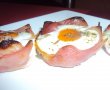 Se pune cate o felie de jambon in fiecare forma de briose, se sparge cate un ou pentru fiecare forma si se presara busuoioc uscat.