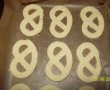 Se presara masa cu faina si se intinde foaie. Se taie covrigeii cu forma.