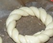 Aluatul crescut il taiem in 10-12 parti. Fiecare parte o impartim in doua si facem snururi pe care le impletim. Tapetam tava cuptorului cu hartie de copt si asezam covrigii. Ii ungem cu ou si presaram sare deasupra. Ii mai lasam 10 minute sa creasca si dam tava la cuptor la 200 de grade timp de 25-30 de minute. Pofta buna.