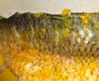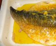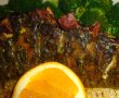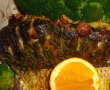 Cel putin de doua ori pe saptamana consum peste . Imi place cel proaspat de apa dulce curgatoare . Eu zic ca suntem niste norocosi ca putem sa ne aprovizionam cu asa ceva . De aceasta data am dorit o usoara aroma de citrice dar mai putin puternica ca lamaia . Am apelat la portocala . Coloristic langa acestea sta bine ca si garnitura putin broccoli [ fara multe calorii ;d] .
