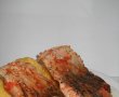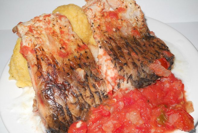 In vasul termorezistent uns cu ulei adaugam sosul de rosii,deasupra adaugam bucatile de crap si dam la cuptor pana scade sosul si se rumeste frumos,