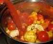 Se adauga apoi rosiile, pasta de tomate si pieptul de curcan, se acopera cratita si se lasa sa fiarba 40-45 minute, pana cand patrunjelul si morcovul s-a inmuiat.