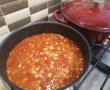 Separat se pun la călit în 2 linguri de ulei de măsline ceapa și ardeiul tocate mărunt. Se adaugă roșiile cubulețe, condimentele și năutul (fără zeama din conservă) și se mai lasă câteva minute până începe sosul să fiarbă. Se pune puiul în sos și se lasă pe foc mediu cu capacul pus până scade lichidul lăsat de roșii.
