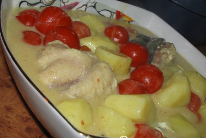 Intr-o cratita, pe foc potrivit, incalzeste laptele de cocos cu praful de curry si apa.Adauga cartofii si lasa-i sa fiarba 15 minute pana cand s-au inmuiat.Adauga rosiile si pestele si lasa-le sa mai fiarba 8-10 minute pana cand pestele s-a facut cat trebuie.