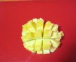 Intre timp preparam chutney-ul, taind mango in doua si eliminand samburele.Miezul il taiem cuburi , apoi pulpa o detasam de coaja cu ajutorul unui cutit.