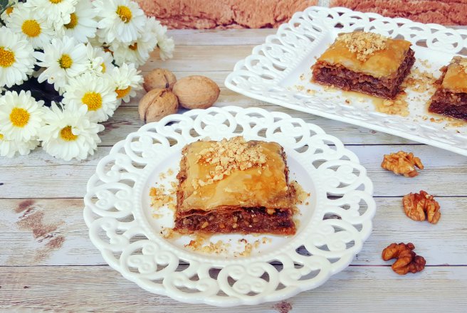 Fata de reteta lui Alex, am folosit cu 200 g mai multa nuca macinata, cu 50 g mai mult unt topit, un mix de condimente, cu 50 g mai putin zahar la sirop si nu am avut apa de trandafiri.