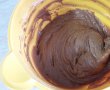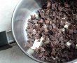 Ciocolata împreună cu untul le topești la bain marie, le lași la răcit câteva minute, apoi le torni peste spuma de ouă.
