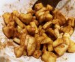 Curatam merele de coaja, le taiem cubulete, presaram peste ele zaharul vanilat si scortisoara dupa gust si le amestecam.