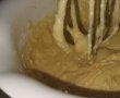 Amestecam cu un tel untul moale de la temperatura camerei cu zaharul 1 minut. Adaugam ouale si iaurtul si amestecam inca 1-2 minute cu telul.