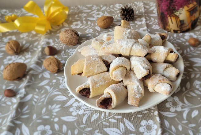 Se rupe din aluat o bucata de aluat. Se intinde pe masa de lucru in forma cat de cat rotunda, se asaza deasupra o farfurie, se decupeaza in jurul ei apoi se taie in 8 triunghiuri. Se asaza pe baza triunghiului o lgt din amestecul de gem si nuca apoi seruleaza cat mai strans, spre varf, formandu-se cornuletul. La fel se procedeaza cu tot aluatul.