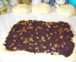 Cat timp a stat la crescut aluatul, am pregatit umplutura. Intr-un castron am amestecat nuca macinata cu cacao si zahar si am adaugat laptele fierbinte, am omogenizat bine.