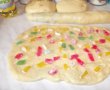 Separat am taiat rahatul bucatele mai mici. Dupa ce aluatul a crescut, am rasturnat pe blatul de lucru si am impartit aluatul in 4 parti aproximativ egale. M-am uns pe maini cu putin ulei si am inceput sa intind prima bucata intr-un dreptunghi, apoi am pus jumatate din umplutura de nuca si am intins bine pe toata suprafata,am presarat cca 30 g stafide, apoi am rulat bine. Am intins si bucata a doua si am asezat jumaatte din bucatalele de rahat, am rulat bine. Am impletit cele doua rulouri si am asezat in tava de cozonac tapetata cu hartie de copt. La fel am procedat si cu cele doua bucati ramase, formand al doilea cozonac. Am lasat sa mai creasca cca 30 min la loc cald, apoi am uns cu galbenus de ou amestecat cu lapte, am presarat zahar brun si mac. Am introdus tavile in cuptorul preincalzit la 180 grade C, pentru cca 45-50 min ( acum depinde de cuptorul fiecaruia), este gata cand trece testul scobitorii. Se scot din cuptor si se lasa sa se raceasca, asta daca ai rabdare......