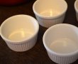 Se pregătesc 6 forme mici din ceramică termorezistentă. Se așază într-o tavă/ formă de copt.