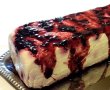 Am invelit tava cu folie alimentara si am lasat-o la rece peste noapte. A doua zi am rasturnat tava si am distribuit peste desert fructele si siropul ramase.