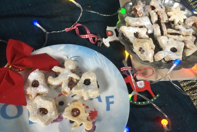 Infainam foarte bine masa de lucru si sucitorul. Rupem o bucata din aluat si il intindem. Decupam ce forme dorim din el dar sa fie cate doua la fel pentru a le lipi impreuna.In unele forme am decupat cate un cerc mic.Dupa le asezam intr-o tava tapetata cu hartie de copt.