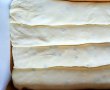 Se pregateste umplutura: intr-un castron se pun branza, galbenusurile, smantana, zaharul, stafidele (clatite in 2-3 ape), esenta de vanilie, grisul si faina si se amesteca. Albusurile se bat spuma cu un praf de sare, dupa care se incorporeaza incet in compozitia cu branza.