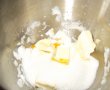 Crema. Se macina biscuitii, se pun in cuva robotului, se adauga si nuca macinata, apoi laptele condensat, samantana, doua linguri de sirop de visine si visinile din borcan. Se mixeaza bine, apoi se intinde o parte din crema peste blat. Cu restul de crema formam niste floricele cu ajutorul unui posh. Ornam cu conffeti.