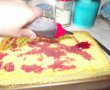 Blat. Am folosit o tava cu dimensiunile de 36/23 cm, tapetata cu hartie de copt. Albusurile cu un praf de sare le-am mixat bine pana am obtinut o spuma tare. Margarina la temperatura camerei impreuna cu zaharul si galbenusurile le-am mixat bine, am adaugat faina cernuta amestecata cu amoniacul. La final am incorporat albusurile batute spuma, cu miscari lente de jos in sus. Am turnat compozitia in tava, am nivelat-o si am dat tava la cuptorul preincalzit la 180 grade C. Este gata cand trece testul scobitorii. Se lasa sa se raceasca bine, apoi se indreapta marginile si deasupra ( daca este nevoie), la mine a crescut un pic neuniform. Apoi se insiropeaza cu siropul de visine.