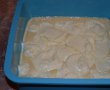 Torni 3/4 din compozitie in tava unsa cu unt. Pui crema de branza din loc in loc, apoi pui murele, iar deasupra torni restul compozitiei.