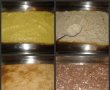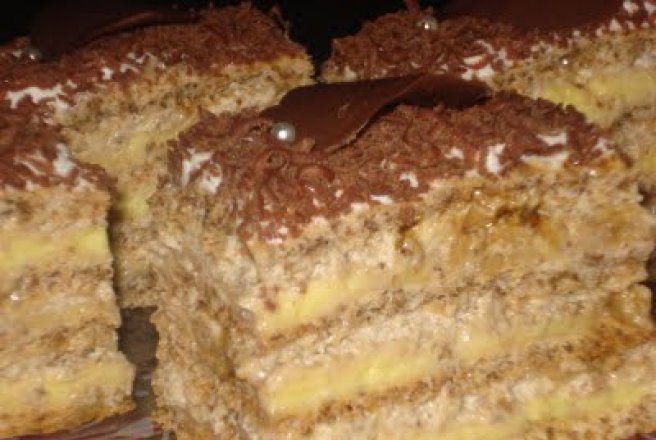 Se fac patru foi si doua creme. Budinca de vanilie si crema de frisca cu zahar ars si nuci.