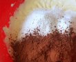 Albusurile se bat spuma cu un praf de sare, apoi se mixeaza cu cealalta jumatate din zahar pana cand devin ca o bezea. Se adauga amestecul de galbenusuri si se omogenizeaza. Se incorporeaza faina, cacaua si praful de copt, amestecand usor, de jos in sus, cu o spatula de silicon. Compozitia se toarna intr-o tava unsa cu ulei si tapetata cu hartie de copt si se introduce la cuptor pana cand trece de testul scobitorii. Se lasa apoi sa se raceasca.