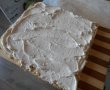 Blatul rece l-am impartit in doua. Pe un platou am asezat prima jumatate , am insiropat cu jumate din cantitatea de sirop si apoi jumate din crema nivelata. Peste vine al doilea blat , cu care procedam la fel .