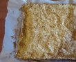Se toarna in tava aluatul si se niveleaza cu o spatula. Peste aluatul crud se intinde bezeaua si se netezeste iar deasupra se presara fulgii de migdale prajiti.