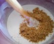 Când se epuizează toată cantitatea de zahăr, iar compoziția are aspectul de bezea, se adaugă nucile rumenite și măcinate, făina de migdale și la urmă, făina albă.