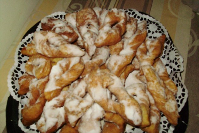 Se prajesc in ulei incins, la foc potrivit, pana se rumenesc pe toate partile. Se scot pe servetele de hartie, apoi se pudreaza bine cu zahar pudra.