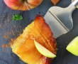 După ce am scos-o din cuptor, folosind muuulte prosoape de bucătărie pentru a nu mă stropi cu caramel, am întors imediat tarta pe un tocător. Am lăsat-o 5 minute să se închege, apoi am tăiat felii.