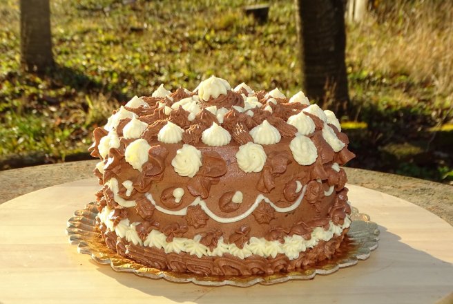 Asamblare : Am sectionat blatul in 4 parti. Am asezat prima parte pe platou, am insiropat-o bine si am intins un strat de crema de vanilie, am nivelat si am asezat a doua parte de blat insiropata bine, peste care am intins un strat de crema de ciocolata, am nivelat si am asezat a treia parte de blat insiropat bine, peste care am intins crema de vanilie ( impartim in asa fel incat sa ne ramane si de ornat), am nivelat si am asezat ultima parte de blat bine insiropat, am imbracat tortul cu crema de ciocolata si am ornat cu cele doua creme, vanilie si ciocolata.