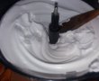 Intre timp pregatim compozitia pentru blat. Mixam albusurile spuma cu un praf de sare si cele 4 linguri de zahar ramase. Galbenusurile le amestecam cu uleiul. Adaugam galbenusurile peste albusuri, incorporam usor cu o spatula. Adaugam apoi treptat faina si praful de copt.