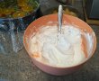 Aducem frisca lichida de la frigider si o mixam pana isi dubleaza volumul si devine o spuma tare. Peste frisca adugam lingura cu lingura crema de ou si amestecam cu atentie pana incorporam toata crema.