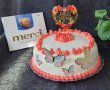 Se bate smantana cu frisca si zaharul pudra pana devine consistenta. Se iau in jur de 3-4 lg din ea si se amesteca cu gelul colorant. Se scoate tortul de la rece si se unge peste tot cu frisca iar din frisca roz se fac moatze dupa imaginatia fiecaruia.