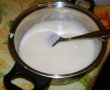 Batem galbenusurile cu zaharul, adaugam laptele, apoi punem compozitia rezultata la foc mic pana se ingroasa mestecand continuu.