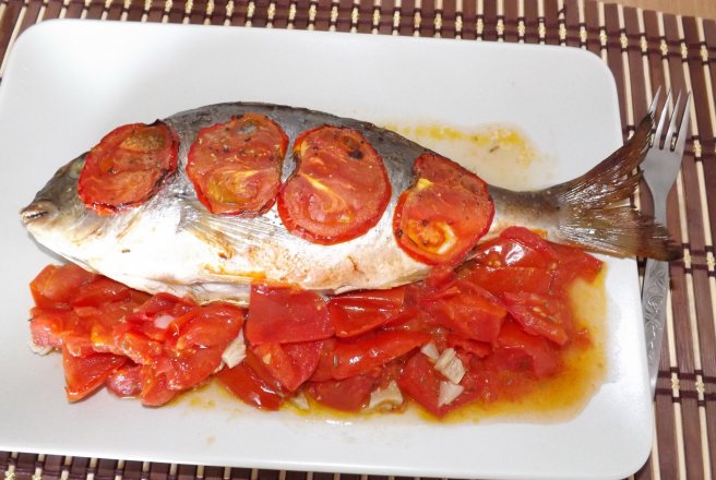 Pestele marinat se pune peste rosii, se pune si vinul alb si se pun citeva feliute de rosii peste peste. Daca mai este necesar se mai condimenteaza putin pe deasupra cu sare, piper si cativa stropi de ulei de masline. Se da la cuptorul incins la 180 grade pt 20-25 minute.