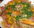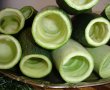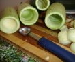 Couscousul se opareste cu supa (la o masura couscus se pune o masura de supa, putin ulei de masline sau unt si se acopera si se lasa 20 minute dupa care se afaneaza cu furculita). Dovlecei se curata si se scobesc pastrand miezul. Ceapa tocata marunt se caleste cu usturoiul zdrobit cu lama cutitului apoi se adauga ardeiul tocat, pieptul taiat cubulete si miezul de dovleac bagat la robot. Punem condimente si la sfarsit adaugam rosiile taiate cuburi, mararul si couscousul facut pe jumatate. Dovleceii se sareaza pe dinauntru si apoi se umplu cu compozitia rezultata. Dovleceii se aseaza in tava, se acopera trei sferturi cu supa calda si se acopera cu folie de aluminiu. Dupa vreo 15-20 de minute se indeparteaza folia, se adauga pasta de rosii, marar si se potriveste de sare. Se mai lasa la cuptor sa se rumeneasca deasupra si sa mai scada. Ceapa se caleste impreuna cu usturoiul, se adauga morcovul apoi carnea, condimentele, pasta de rosii, mararul si la urma couccoucul oparit ca la umplutura 1. Se potriveste umplutura de sare si se umplu dovleceii. Se pregatesc ca mai sus si se servesc cu sana sau lapte batut si marar proaspat.