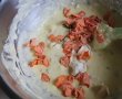 Între timp se prepară umplutura. Într-un vas adânc se pune brânza de vaci, brânza de burduf, ceapa prăjită, ouăle, boabele de porumb scurse de lichid și se amesetecă până se combină ingredientele. Ardeiul și morcovii se spală se curăță și toacă mărunt, felii subțiri după caz, apoi se adaugă în crema de brânză împreună cu mezelurile tocate mărunt, se mestecă până se înglobează toate ingredientele.