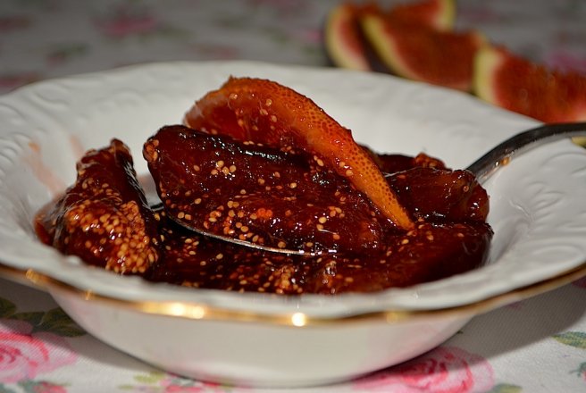 Am adaugat smochinele taiate in sirop, am amestecat si am lasat sa fiarba la foc moale. Aproape de final, cand a scazut bine, am adaugat felii de lamaie, taiate in jumatate, pentru a aroma dulceata.