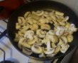 2.Intre timp punem o tigaie la incins cu putin ulei de masline,usturoiul curatat si zdrobit si pasta de ardei iute.Spalam brocolii si ii taiem buchetele si ii punem in tigaie.Punem un capac si lasam sa se inmoaie la foc mic.Cand s-au facut brocolii,ii scoaem si adaugam ciupercile spalate si taiate rondele circa 5mm.Lasam sa scada si ii punem deoparte.