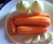 Morcovii se taie rondele, ceapa se toaca marunt, usturoiul se poate lasa intreg.