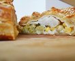 Legumele se spala si se scurg de apa, apoi se condimenteaza si aseaza in forma de dreptunghi pe jumatate din aluat de foietaj, lasand margini de 1 cm. Pestele se aseaza peste legume, se ung marginile cu oul batut, se pliaza aluatul, iar daca ramane aluat in exces pe margini se taie si se aseaza deasupra sub ce forma doriti. Se inteapa cu cutitul din loc in loc si se transfera intr-o tava tapetata cu hartie de copt. Se unge deasupra cu ou si se presara susan.