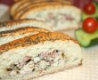 Impletim aluatul, trecand o fasie din stanga in drepata, peste umplutura, pe cea din dreapta o trecem in stanga si repetam pana terminam de impletit. Asezam painea intr-o tava unsa cu putin ulei si tapetata cu hartie pentru copt.