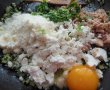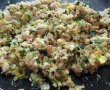 Puneti o lingura de ulei de masline intr-o tigaie. O transferati pe foc, puneti cuburile de dovlecel si un praf de sare. Le sotati la foc mic, pana dovleceii se inmoaie. Dati deoparte sa se raceasca. Peste cuburile de dovlecei puneti tonul scurs bine de lichid, urda faramitata cu mana, parmezanul si oul. Busuiocul il tocati marunt, il puneti peste amestecul de mai sus, presarati sare si piper.