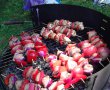 Carnea de pui se taie cubulete si se marineaza in bere amestecata cu condimentele de mai sus si se lasa la rece trei ore.Apoi taiem ceapa, rosiile, ardeiul gras in bucati si le introducem pe betele de frigarui alternand carnea, rosiile, ceapa si ardeiul.