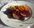 Am pregatit marinata amestecand ingredientele enumerate si am turnat deasupra pulpei de caprioara. Am lasat la figider pana a doua zi. Am curatat carnea de caprioara de bobite si am infasurat-o cu sfoara. Aam asezat carnea intr-un vas de Jena si am lasat-o aproximativ 10 minute in cuptor la 250 de grade Celsius. Am scos carnea din cuptor am adaugat vinul si restul condimentelor. Am acoperit vasul cu capac si am lasat se se coaca la 190 de Grade Celsius pana cand carnea a fost facuta. Pentru sos am pus la fiert visinele cu fructoza, am adaugat vinul si condimentele si am lasat sa fiarba pana cand sosul a scazut putin.